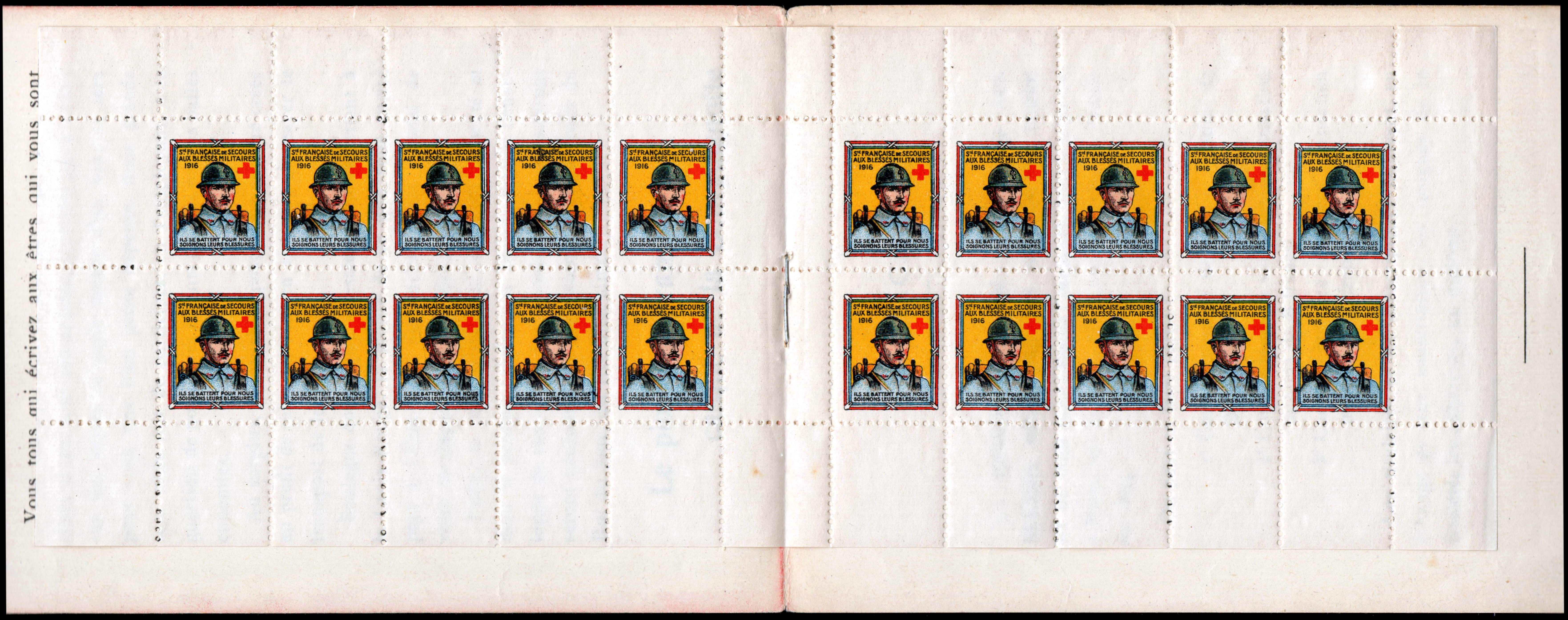 26/1 – Carnet de 20 timbres (2 planches de 10 – 2 x 5) sous couverture RH 135 x 90. A gauche, reproduction du timbre. A droite, croix rouge et texte en bleu « Société française de Secours aux Blessés militaires – Carnet de 20 timbres – Prix : 1 Franc« . A l’intérieur, à gauche, en bleu : « But et organisation de la Société de Secours aux Blessés militaires ». Au verso, texte sur la mise en vente d’une plaquette symbolisant la « Force par l’Union » et commémorant les accords prix à Paris le 28 mars 1916.