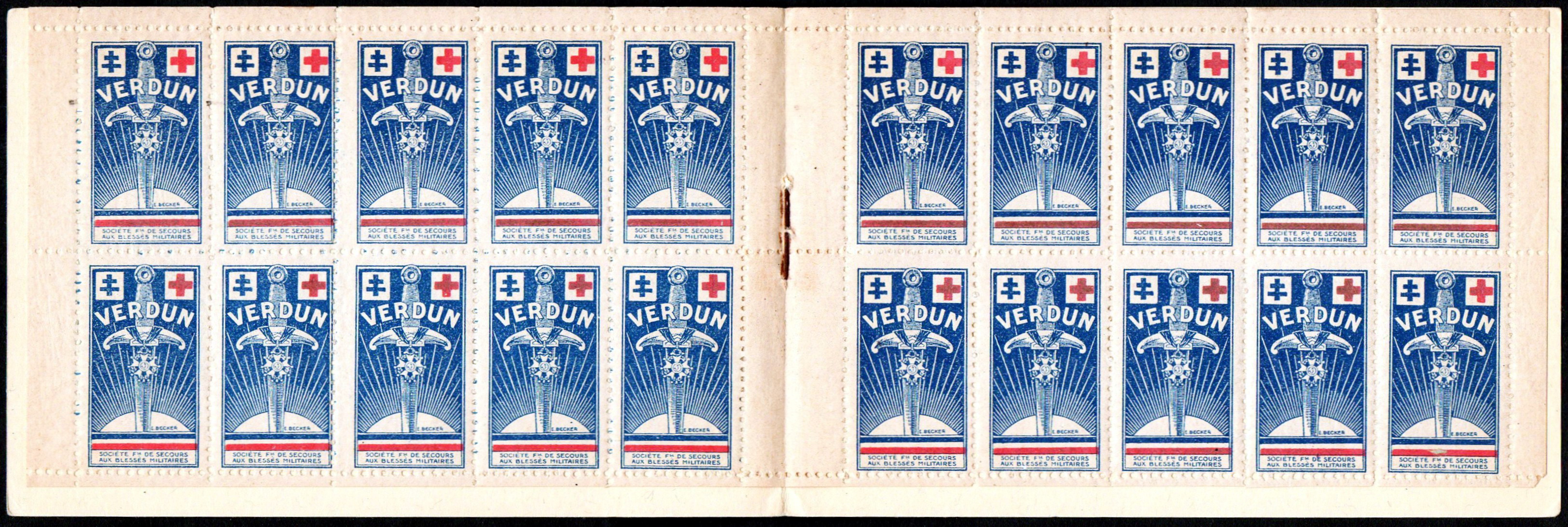 Un timbre RV 19 x 35 identique comme dessin au précédent mais sur fond bleu foncé. Les rayons du soleil et le mot « Verdun » se détachent en blanc sur fond bleu foncé. Dans le haut, la croix de Lorraine et la croix rouge se détachent sur des carrés blancs. Dentelé. Bleu foncé et rouge (nuances de bleu).