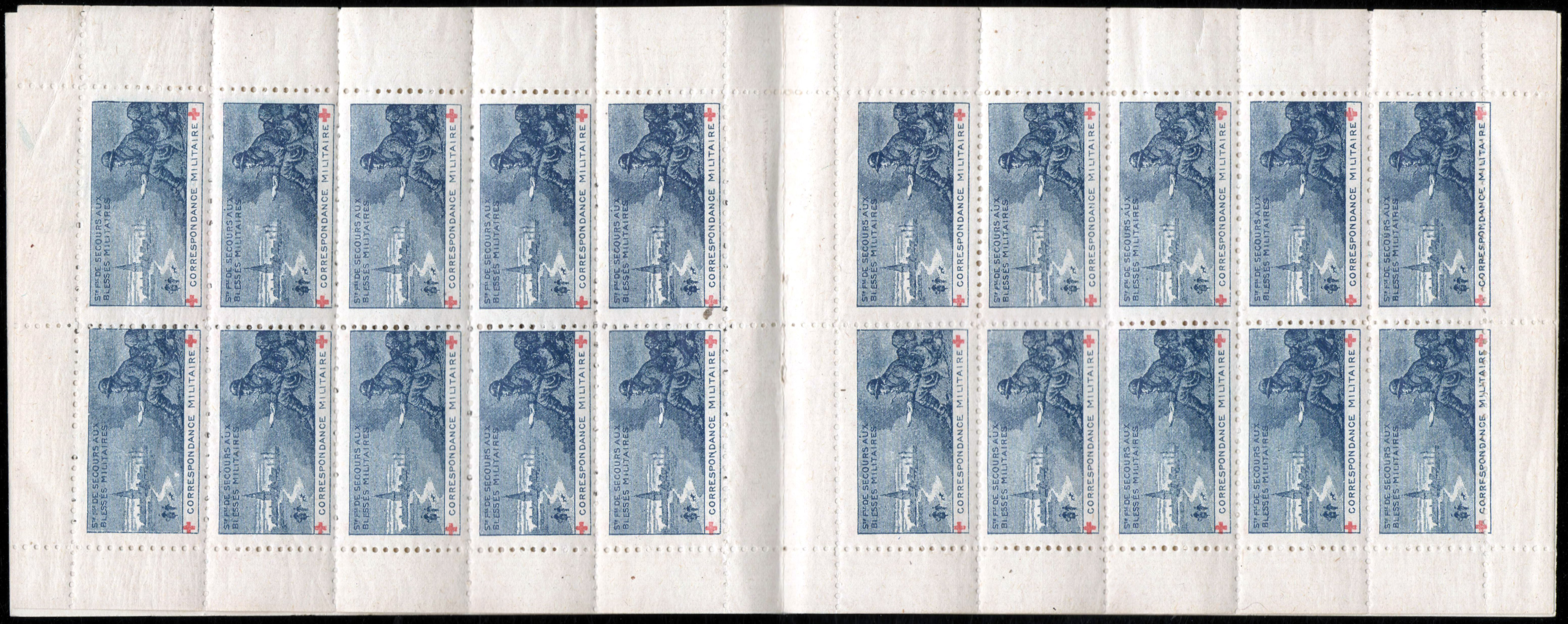 28 – 1916. Un timbre RH 34 x 18. A gauche, soldat dans une tranchée lisant une lettre. A gauche, silhouette d’un village et personnage sur un chemin. En haut, à gauche : « Sté Fse de Secours aux Blessés Militaires ». En bas, dans un cartouche blanc entre deux croix rouges : « Correspondance militaire ». Dentelé. Bleu et rouge.