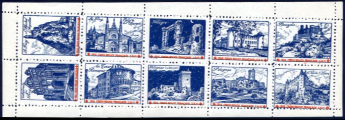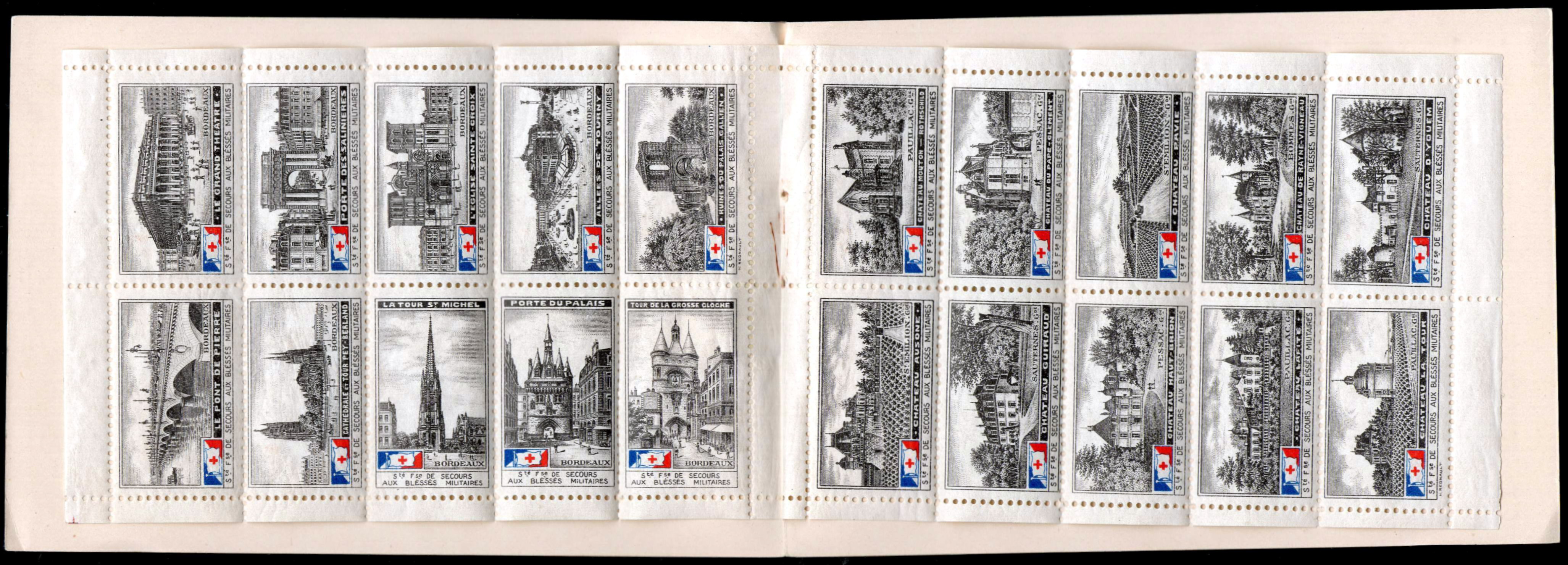 31 – 1917. « Bordeaux et le Bordelais ». Série de 20 timbres 36 x 22, vues diverses. Dans le bas, dauns un cartouche : « Sté Fse de Secours aux Blessés militaires ». Au-dessus de ce cartouche, à gauche, emblème de la S.S.B.M. Dentelé. Noir, bleu et rouge.