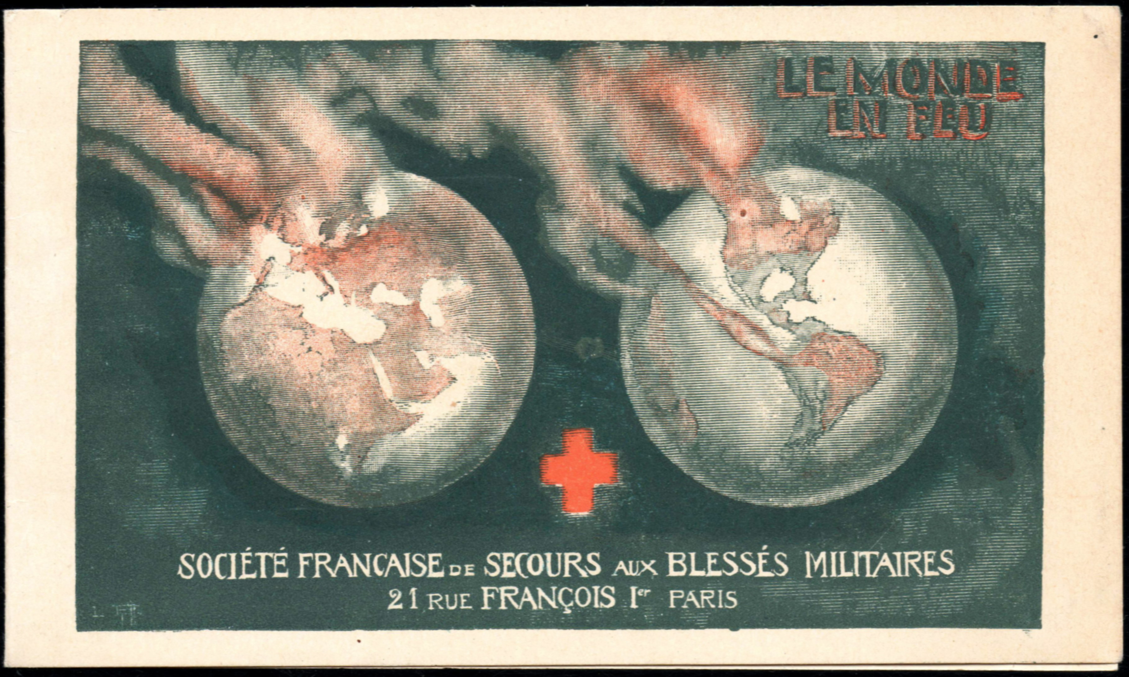 5 – 1913. 1 timbre RV 18 x 22. Drapeaux français et de la Croix-Rouge superposés. Le plis de gauche du drapeau de la Croix Rouge est fait de lignes noires. Fond du timbre formé de lignes bleues parallèles. Texte en haut : « Société française de Secours aux Blessés militaires ». En bas : « 21, rue François Ier ». Grandes marges. Dentelé. Bleu, rouge et vermillon, texte en noir.