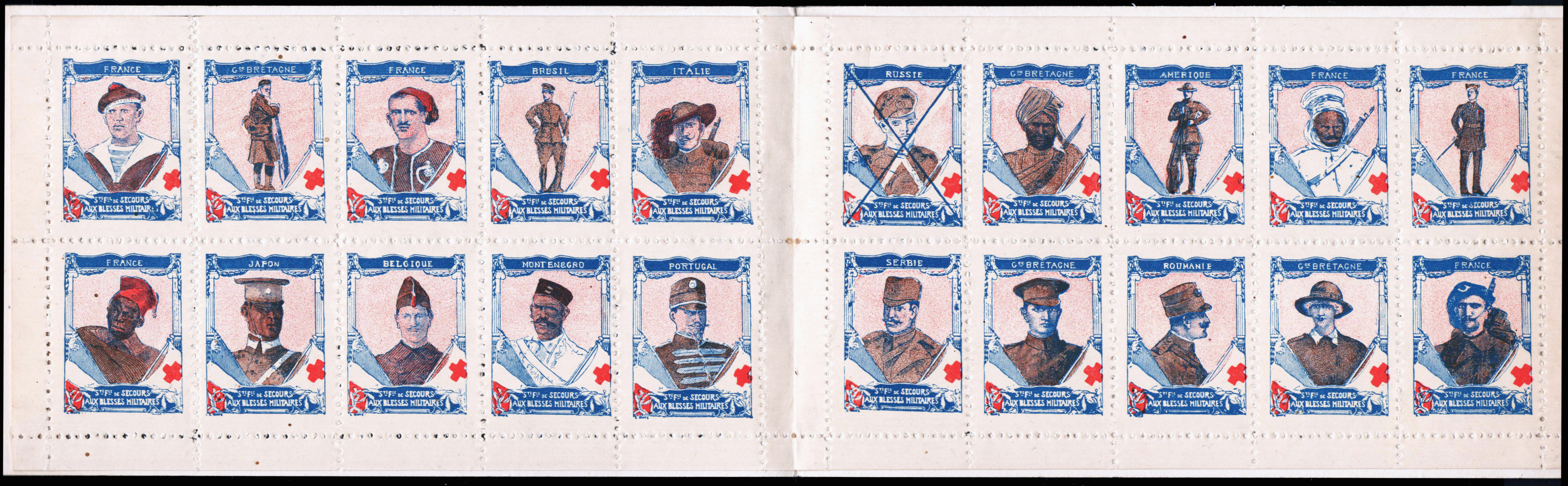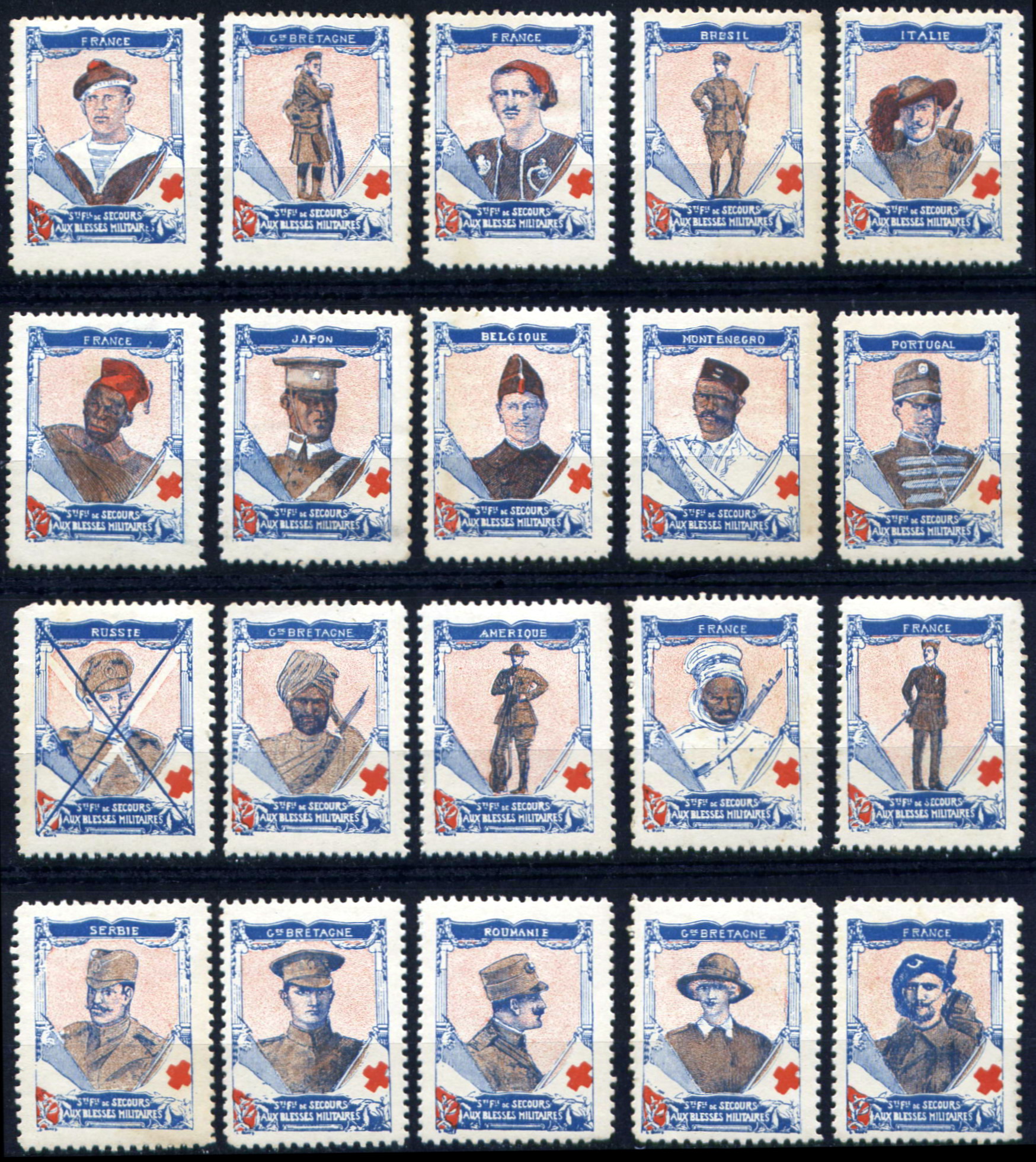 Série de 20 timbres RV 22x 31, représentant , en pied ou en buste, des soldats alliés. cadre identique pour les 20 timbres : en haut, nom du pays du soldat représenté, dans un cadre reposant sur deux colonnades. En bas, à gauche, drapeau français ; à droite, drapeau de la Croix-Rouge. Au centre, en blanc sur fond de couleur : « Sté Fse de Secours aux Blessés militaires« .