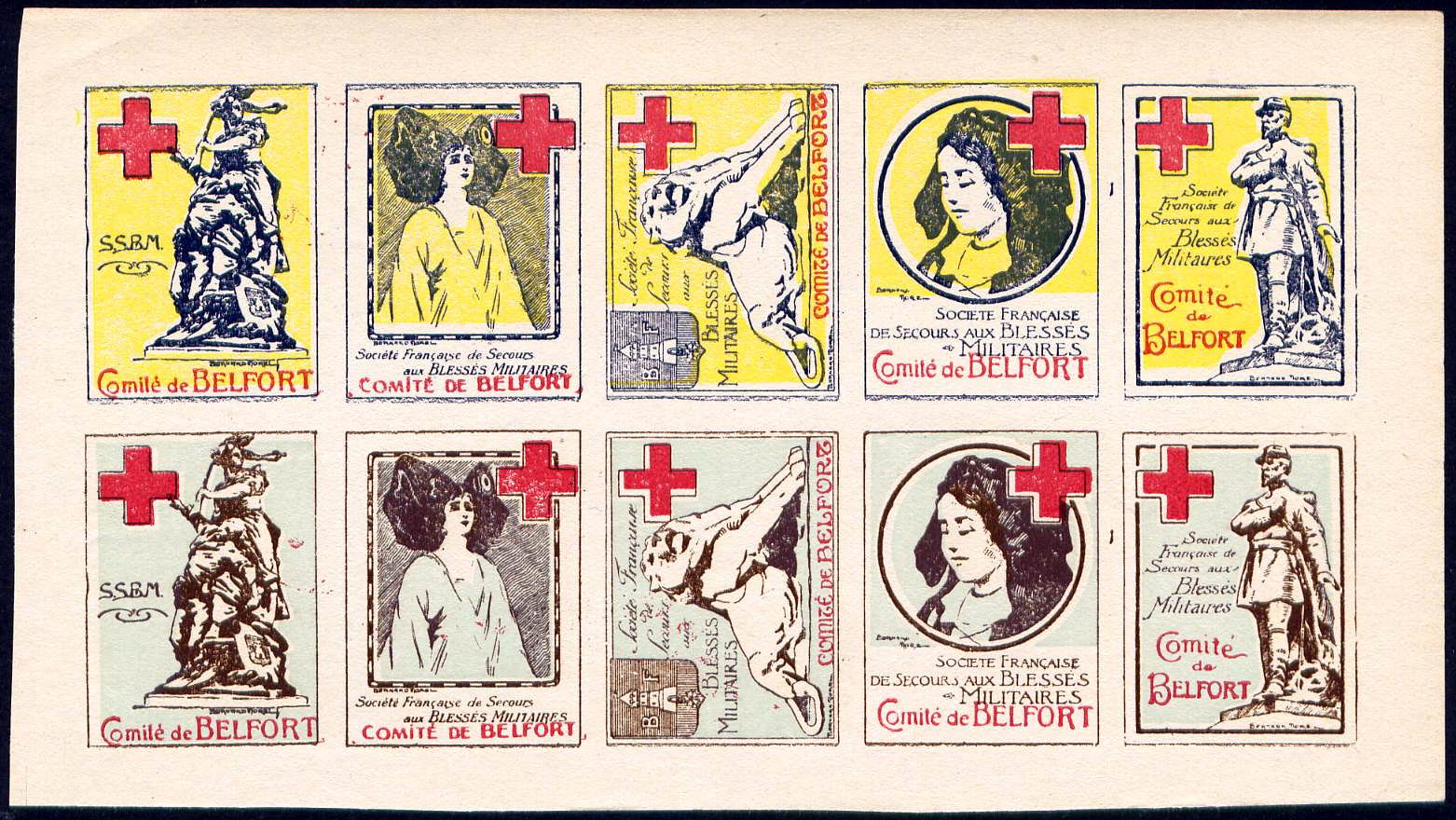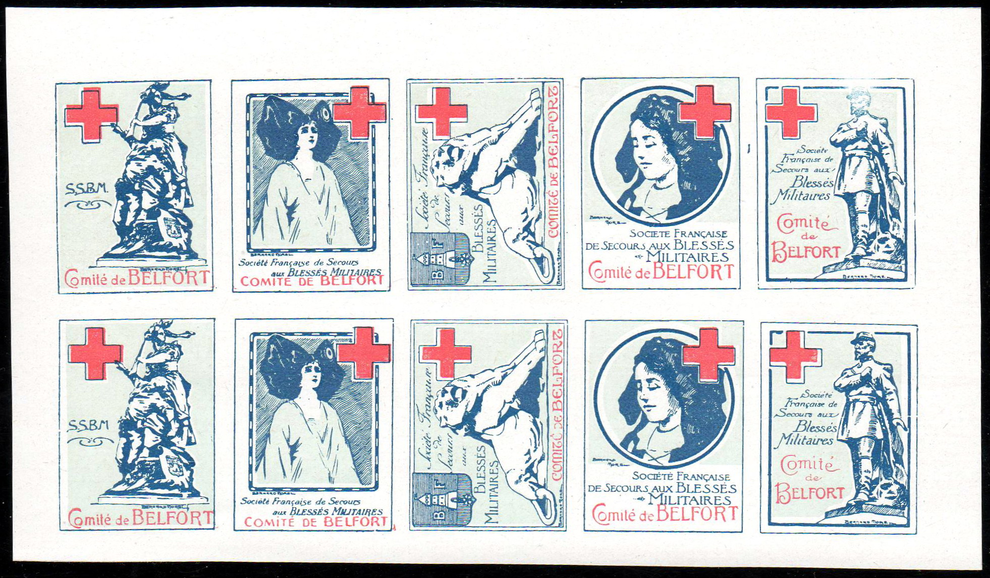 37 – 1916. Comité de Belfort. Série de 5 timbres se tenant en bande horizontale. Tous 27 x 35 avec une croix rouge et le nom de la Société, sauf le premier qui ne porte que les initiales S.S.B.M. Edition Delandre.