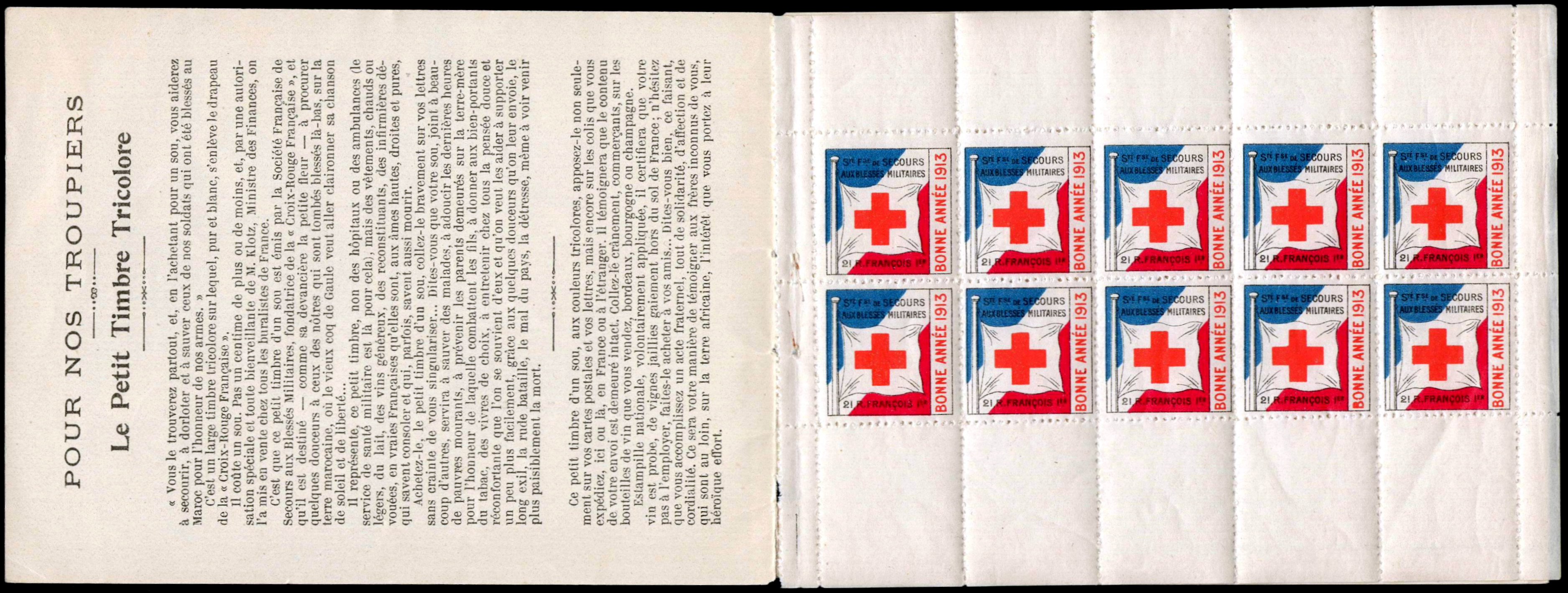 4 – Décembre 1912. 1 timbre carré 22 x 22. Type analogue à celui du n° 1. Drapeau de la Croix-Rouge sur fond rayé diagonalement aux couleurs nationales. texte en haut : « Société française de Secours aux Blessés militaires ». En bas : « 21, rue François Ier ». Rectangle vertical à droite avec texte en rouge : « Bonne année 1913 ». Dentelé. Bleu et rouge, inscriptions noires.