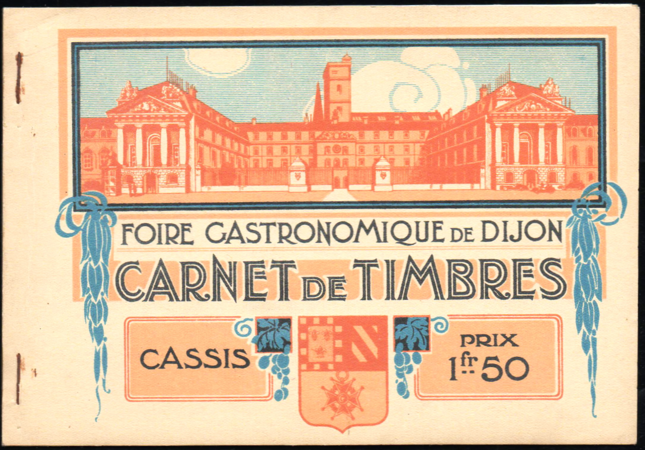Bouteille de cassis à droite et Palais des Ducs de Bourgogne au fond. RH. Dentelée. Polychrome.
