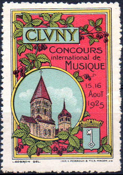 Vue d’un clocher dans un médaillon rond entouré de feuillages. En bas, à droite, armes de Cluny.