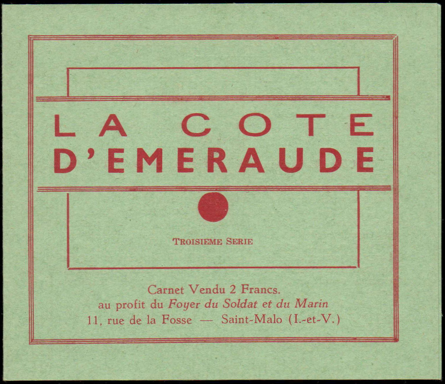 3 carnets (sans nom d’imprimeur) – Editions Braun et Liorit – Dinard contenant 12 vignettes – Impr. J. Le Marigny – La Seyne, vendues au profit du Foyer du Soldat et du Marin, 11, rue de la Gosse – St-Malo.