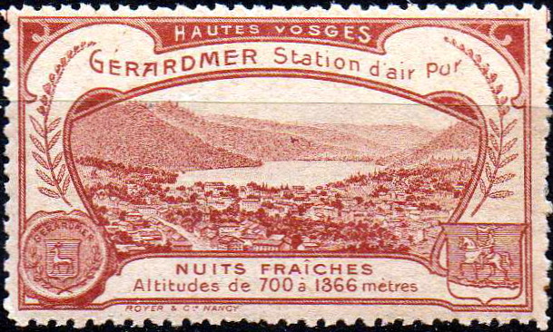 1902 – Vue générale. Inscriptions en haut : « Gérardmer / Station d’air pur » ; en bas, « Nuits fraîches. Altitude de 700 à 1366 mètres ».
